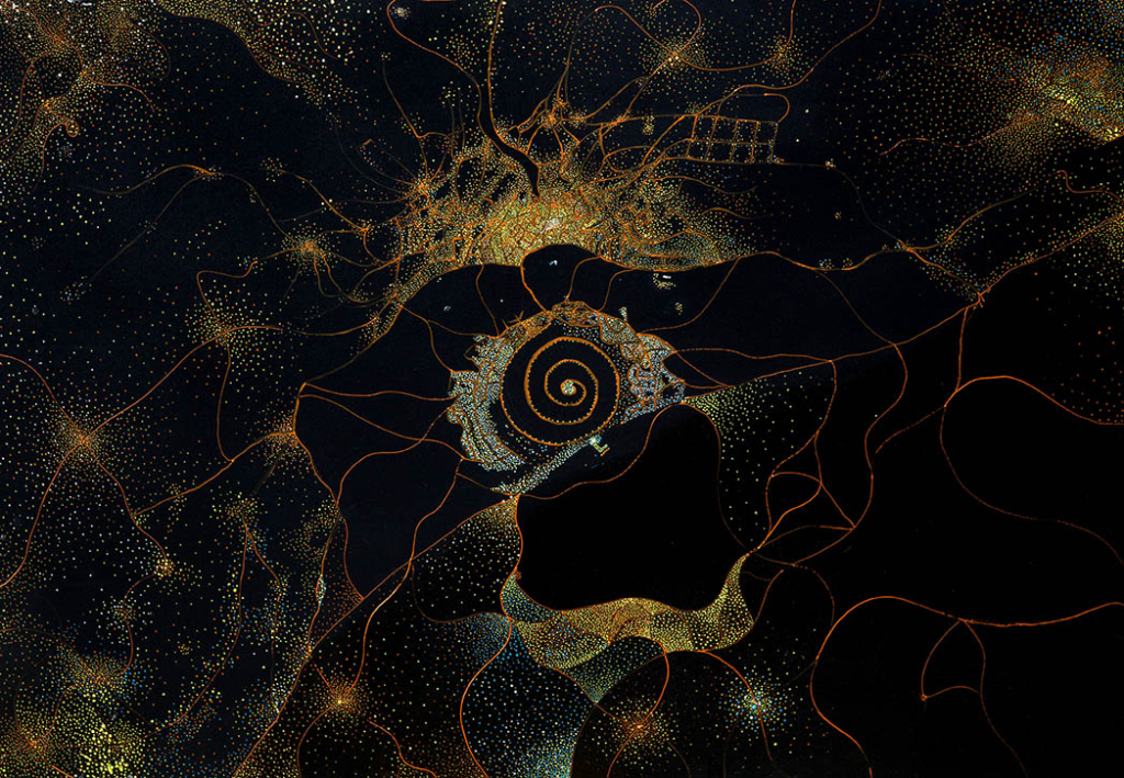 “Bir gün rüyamda kendimi Anka Kuşu’nun kanadında, İstanbul’un üzerinde gece karanlığında uçarken gördüm. Kuşun kanatlarından aşağıya baktığımda şehrin ışıkları nokta şeklindeydi. Uyandığımda çocukluğumdan beri hayal ettiğim antik şehirleri artık nasıl çizeceğimi biliyordum. Form arayışından uzakta, çizgisel bir yaklaşımla oluşturduğum antik kentler, bu kentlerde yaşamış karakterler ve gökyüzünde uçan mitolojik kuşlar çizmeye başladım.