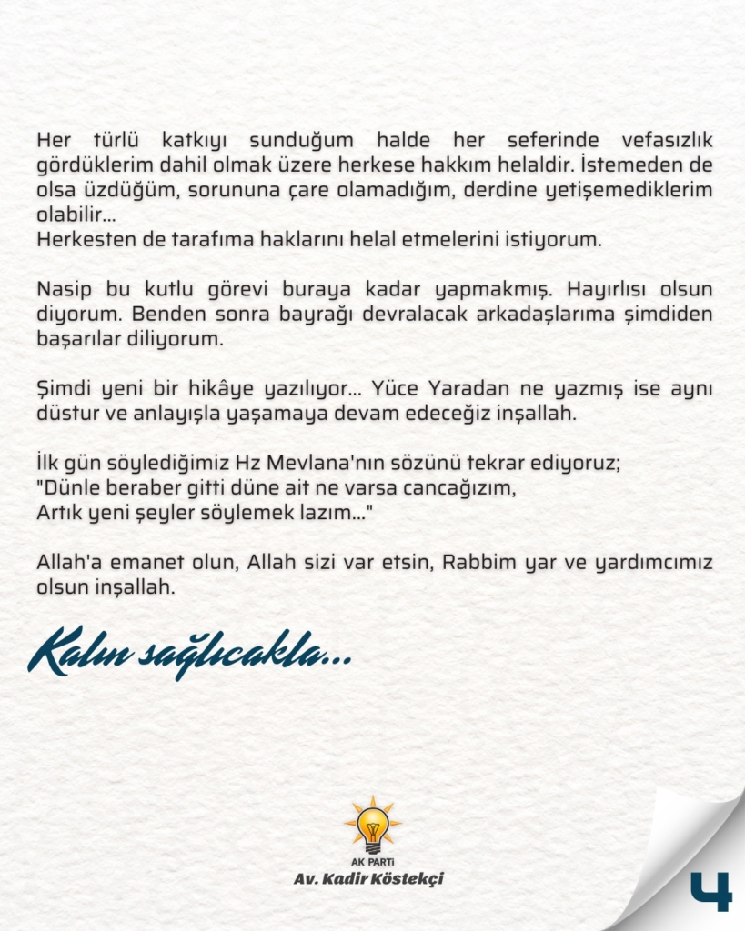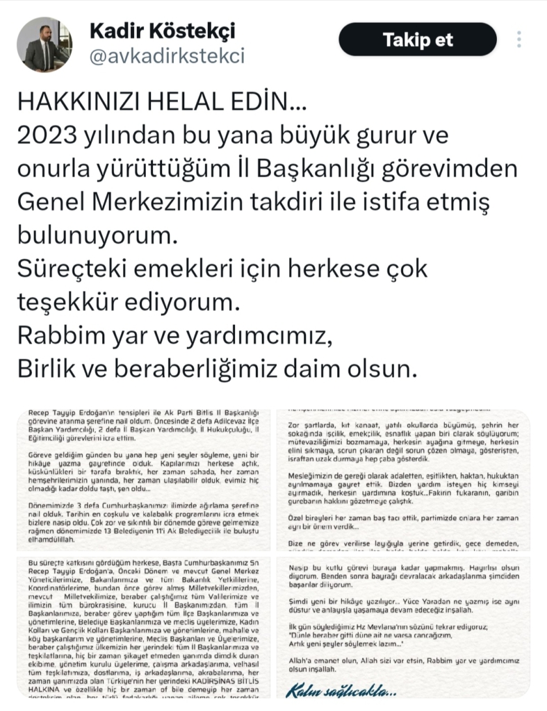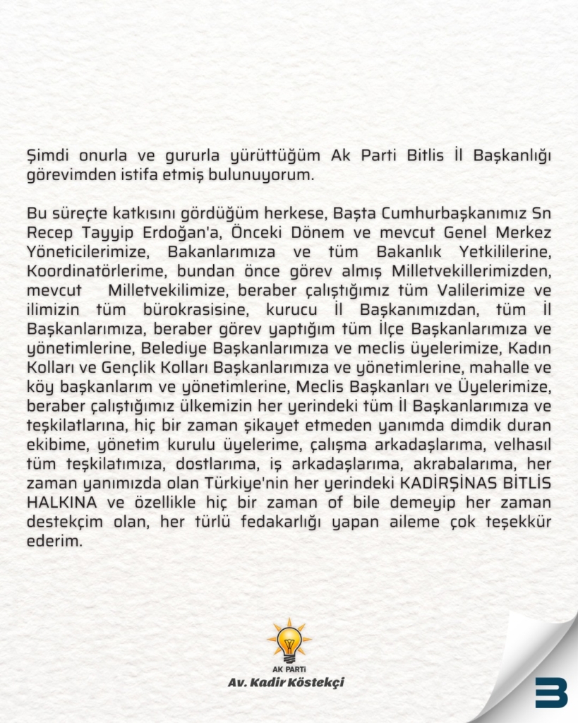 Görevi süresince herkesi kucaklamaya çalıştığını kaydeden Köstekçi, “Onurla ve gururla yürüttüğüm AK Parti Bitlis İl Başkanlığı görevimden istifa etmiş bulunuyorum.” ifadesini kullandı.